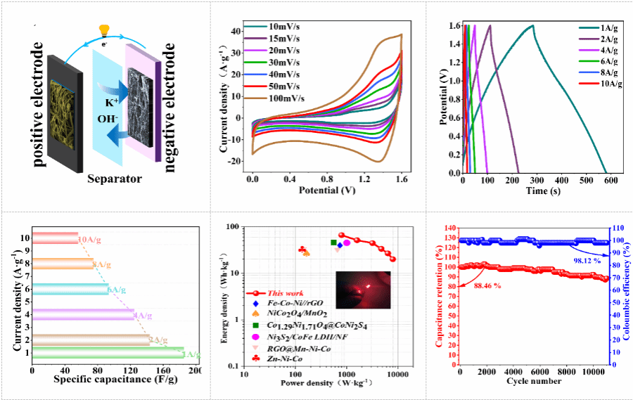 该研究针对超级电容器能量密度较低,在高功率密度下难以兼顾高能量密度及其循环稳定性等关键问题,创新地采用一次水热法合成了高性能超级电容器正极材料NiO-(NiFeCo)O,同时采用静电自组装方法制备了负极材料SiO2/rGO(图1),通过表征分析及电化学性能测试系统评估了该正极材料的电化学性能,并对采用该静电自组装法制备的负极材料所组装的非对称超级电容器开展了储能特性研究。结果表明,该研究合成的正极材料NiO-(NiFeCo)O在1 A/g的电流密度下展现出1414.54 F/g的高比电容,经过3,000次循环后电容保持率仍高达98.35%,表现出优异的电化学性能与循环稳定性(图2)。组装成的非对称超级电容器在800 W·kg⁻¹的功率密度下实现了66.0 Wh·kg⁻¹的高能量密度,且经过11,000次循环后电容保持率为88.46%(图3)。