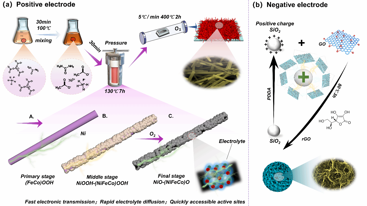 能源与动力工程学院范晶教授、宋粉红教授在能源领域高水平期刊《Energy》(IF=9.4)发表研究论文“Novel rough nanorods NiO-(NiFeCo)O as positive electrode of high-performance asymmetric supercapacitors assembled with SiO2/rGO negative electrode”。该研究提出一步水热法合成具有三维粗糙纳米棒网络结构的高性能正极材料NiO-(NiFeCo)O,并以静电自组装方法合成SiO2/rGO作为负极组装非对称超级电容器器件,实现了高能量密度、高功率密度与卓越循环稳定性的协同兼顾,为新能源汽车、智能电网等领域高效储能解决方案的落地应用奠定了重要基础。该论文由范晶教授团队独立完成,东北电力大学为论文独立完成单位,宋粉红教授为论文第一作者,范晶教授为通讯作者。